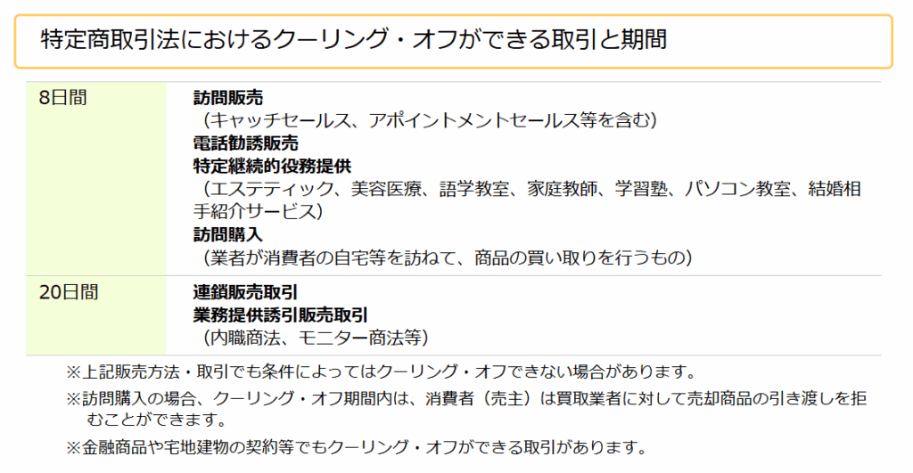 消費者は、契約から8日以内であればクーリングオフが可能です。