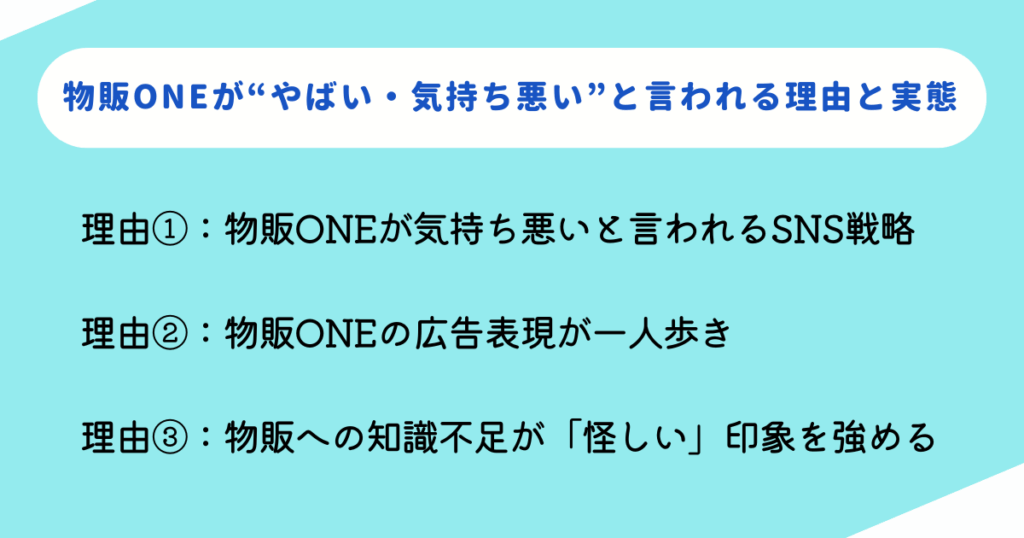 「物販ONEって“やばい”とか“気持ち悪い”って言われてるけど、なぜ?」と疑問に感じた方もいるかもしれません。