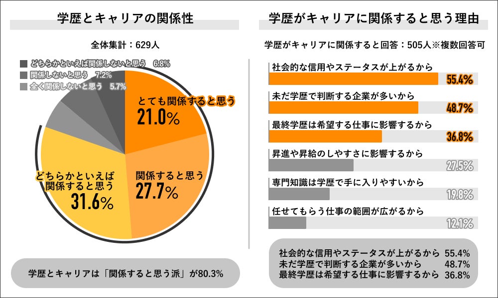 ある調査によると、「学歴はキャリアに関係する」と回答した人は全体の80.3%にのぼり、その理由として最も多かったのが「社会的な信用やステータスが上がるから」(55.4%)でした。