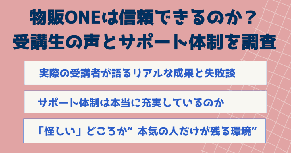 ここでは、外からは見えづらい実際のサポート体制や、受講生のリアルな体験談をもとに、物販ONEが本当に信頼できる環境なのかどうかをフラットな視点で掘り下げていきます。