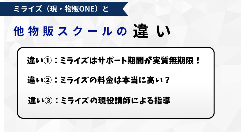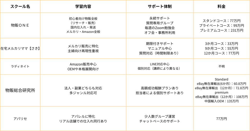 さらに、以下の表では、ミライズ(現・物販ONE)と、他の代表的な物販スクールの料金やサポート内容を比較しています。